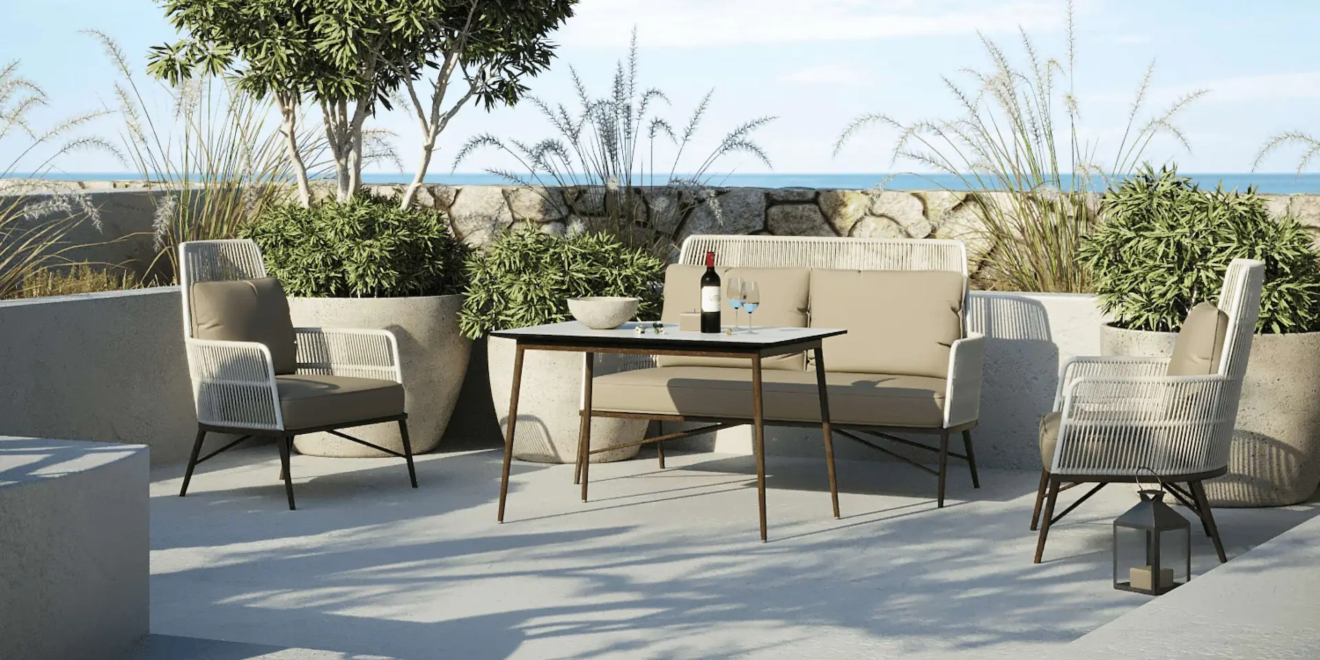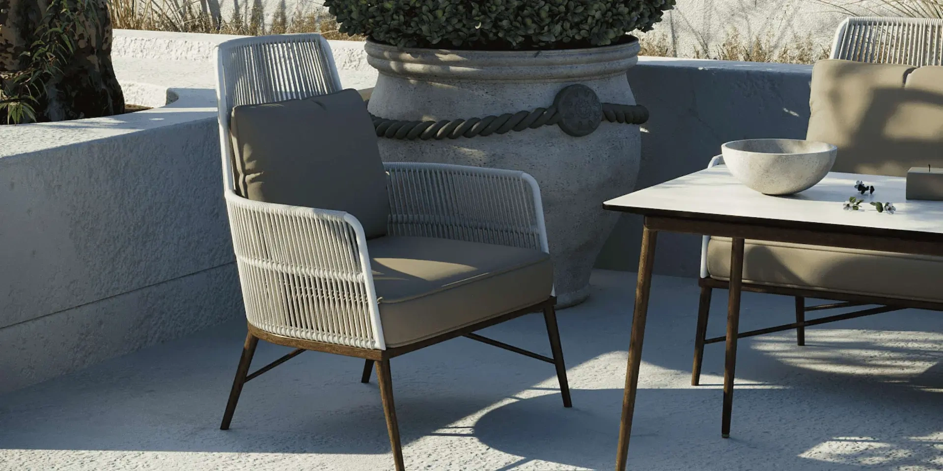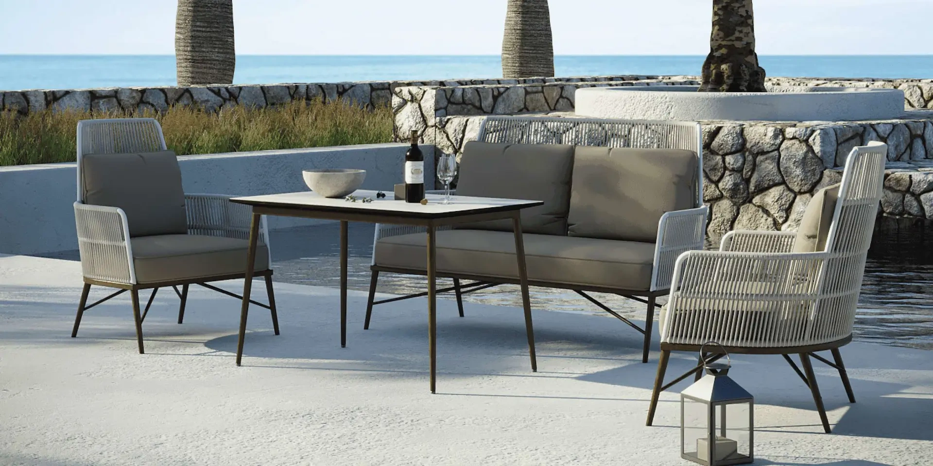 Tron Oturma Grubu, dayanıklı ip detayları ve modern tasarımıyla dış mekanlarınıza sofistike bir hava katar. Rahat minderleri ve sağlam alüminyum iskeletiyle uzun ömürlü kullanım sağlar.